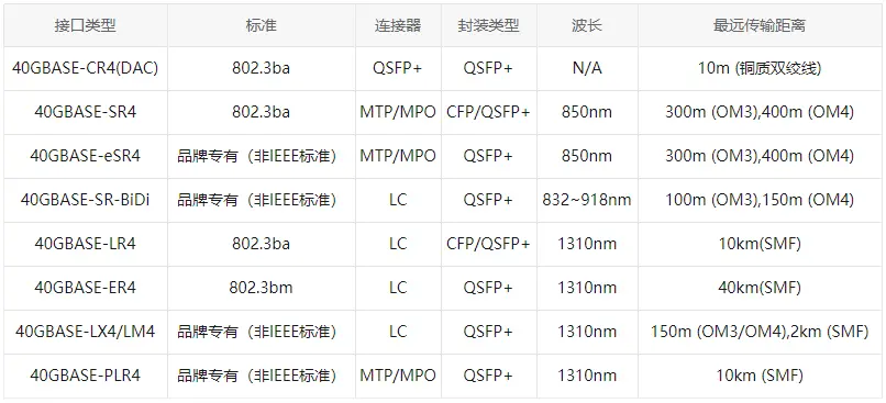 根据IEEE与MSA制定的40G协议标准,市面上有两类主要的40G模块:QSFP+模块和CFP模块。QSFP+光模块有4条发送和4条接收通道,支持40G以太网单多模光纤应用。CFP模块的尺寸规格比QSFP+更大,通常用于100G以太网,但也支持40G。这两种模块类型都有许多不同的接口类型。随着网络的发展,又不断出现新的40G模块端口和标准。下面列出了一些40G光模块的主要接口类型;