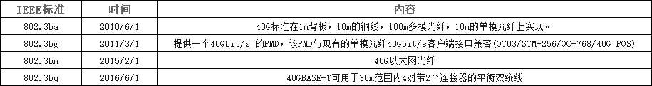 早在2007年,IEEE 802.3ba工作组首次提出将40G以太网作为高速以太网项目之一。2010年,40G以太网被正式批准为IEEE 802.3ba标准,允许以太网帧以40gbit /s的速率传输。该标准同时定义了包括背板、铜线、多模单模光纤通信的物理层规范。随着40G以太网的发展,802.3ba标准有了很多新的补充内容,如802.3bg-2011、802.3bj-2014、802.3bm-2015等。下表列出了一些40GbE相关的IEEE标准规范。