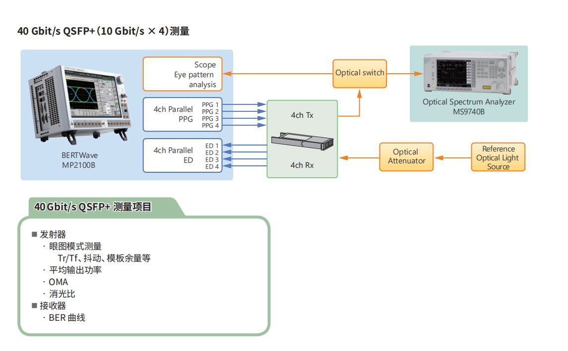 数据中心部署采用QSFP+等多通道光学模块,以应对数据流量的迅猛增长。借助内置的4通道BERT,MP2100B支持所有QSFP+通道的同步测量。此外,由于同时内置BERT和示波器,因此还可以在执行BER测量时监测波形,从而将测试时间缩短近一半。