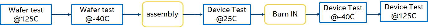 芯片根据应用领域,温度和可靠性要求的不同,需要定义不同的test insertion。比如汽车电子的产品测试流程如下共有5个test insertion,如此多的test insertion是因为汽车电子的DPM要求zero defect,必须在不同温度下多次测试最大限度地筛选新品。